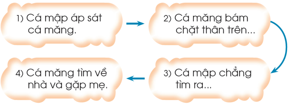1. Cá mập áp sát cá măng => 2. cá măng bám chặt thân trên cá mập => 3. cá mập chẳng tìm ra cá măng => 4. cá măng tìm về nhà và gặp mẹ.