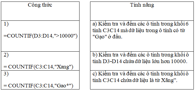 Chọn phương án đúng. Cách viết hàm COUNTIF trong Excel là