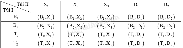 Túi I có hai viên bi màu đen, kí hiệu là \({B_1},{B_2}\) và 2 viên bi màu trắng, kí hiệu là \({T_1},{T_2}\). Túi II có 3 viên bi màu xanh, kí hiệu là \({X_1},{X_2},{X_3}\) và 2 viên bi màu đỏ, kí hiệu là \({D_1},{D_2}\), các viên bi có cùng kích thước. Từ mỗi túi lấy ngẫu nhiên một viên bi.