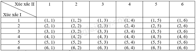 Kết quả phép thử được viết dưới dạng (a, b) trong đó a, b lần lượt là số chấm xuất hiện trên hai con xúc xắc I và II.