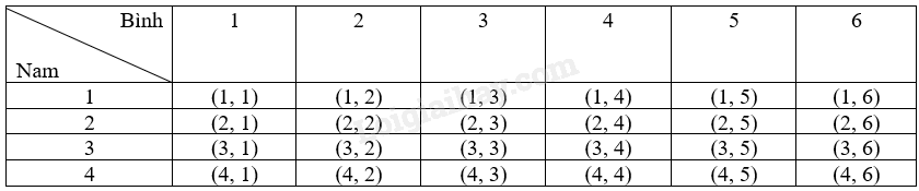 Không gian mẫu \(\Omega = \){\(\left( {a,b} \right),1 \le a,b \le 6\)}, trong đó a và b là các số tự nhiên}, a, b lần lượt là số ghi trên thẻ khi Nam quay và số chấm trên con xúc xắc Bình gieo. Ta liệt kê được tất cả các kết quả có thể của phép thử bằng cách lập bảng như sau: