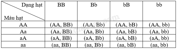 Cây con có hạt vàng và trơn nếu trong gene màu hạt có ít nhất 1 allele trội A và trong gene dạng hạt có ít nhất 1 allele trội B.