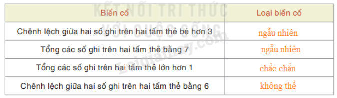 Có hai chiếc hộp, mỗi hộp đựng 6 tấm thẻ ghi các số 1;2;3;4;5;6. Rút ngẫu nhiên một tấm thẻ từ mỗi hộp. Thay dấu “?” bằng các từ thích hợp trong các từ sau: ngẫu nhiên, chắc chắn, không thể.