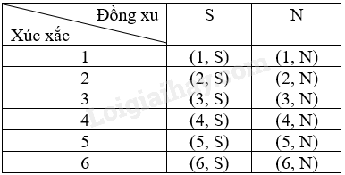 Mỗi ô ở bảng là một kết quả có thể. Không gian mẫu là \(\Omega = \){(1, S); (2, S); (3, S); (4, S); (5, S); (1, N); (2, N); (3, N); (4, N); (5, N), (6, S), (6, N)}. Có 12 kết quả có thể là đồng khả năng.