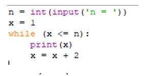Cách 1: Sử dụng vòng lặp while: Khởi tạo x = 1 là số nguyên dương lẻ nhỏ nhất, cho đến khi x ≤ n ta in ra x sau đó tăng x lên 2 đơn vị. Tham khảo chương trình sau: