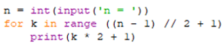Cách 2: Sử dụng vòng lặp for: Dãy số lẻ cần in ra là 0 × 2 + 1, 1 × 2 + 1, 2 × 2 + 1, ..., k × 2+ 1, trong đó k là giá trị số nguyên lớn nhất thoả mãn: k × 2 + 1≤ n, tức là k=[n−12]. Tham khảo chương trình sau: