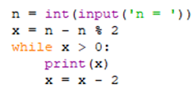 Cách 1: Sử dụng vòng lặp whi1e: Khởi tạo x = n -n % 2 cho đến khi x > 0 ta in ra x sau đó giảm x đi 2 đơn vị. Tham khảo chương trình sau: