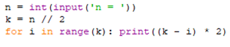 Cách 3: Ta cũng có thể sử dụng vòng lặp for nhưng sửa lại khai báo range để mỗi bước giá trị số in ra được giảm đi 2 đơn vị. Tham khảo chương trình sau: