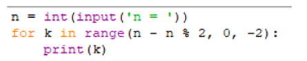 Viết chương trình nhập vào số nguyên n và in ra các số nguyên dương chẵn không lớn hơn n theo thứ tự giảm dần.