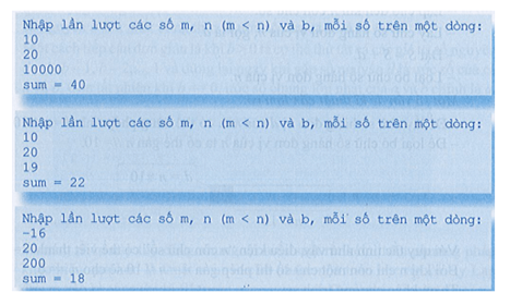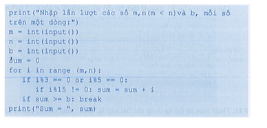Viết chương trình đưa ra màn hình tổng các số nguyên chỉ chia hết cho 3 hoặc 5 nhưng không đồng thời chia hết cho cả 3 và 5 trong phạm vi các số nguyên từ m đến n-1. Ngừng tính tổng khi nhận được tổng lớn hơn hoặc bằng b cho trước. Các số nguyên m, n, b được nhập vào từ bàn phím với m < n.