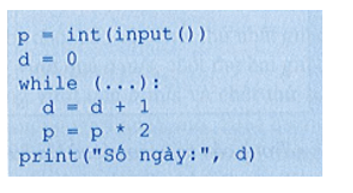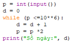 Virus X có khả năng lây nhiễm mạnh, sau mỗi ngày số lượng người nhiễm tăng lên gấp đôi. Cụ thể, nếu ngày hôm nay có p người bị nhiễm thì sang ngày tiếp theo sẽ có 2p người bị nhiễm. Chương trình sau đây cho nhập vào số lượng người bị nhiễm và đưa ra sau bao nhiêu ngày thì số lượng người bị nhiễm sẽ vượt quá 1 triệu người. Em hãy hoàn thiện câu lệnh còn khuyết để nhận được chương trình đúng.