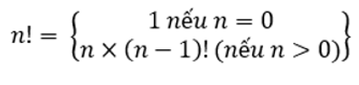 Giai thừa của n (kí hiệu n!) là tích của các số nguyên dương từ 1 tới n. Ta cũng có thể định nghĩa quy nạp như sau:
