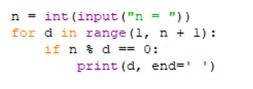 Cách 1: Một trong những giải pháp đơn giản là thử mọi giá trị số nguyên d từ l tới n, mỗi khi gặp một giá trị ở là ước số của n thì in ra ngay giá trị d đó. Tham khảo chương trình sau: