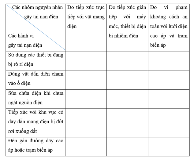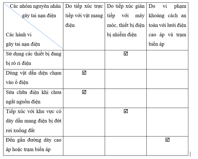 vào ô thích hợp để xác định những hành vi gây tai nạn điện thuộc nhóm nguyên nhân nào trong bảng dưới đây.
