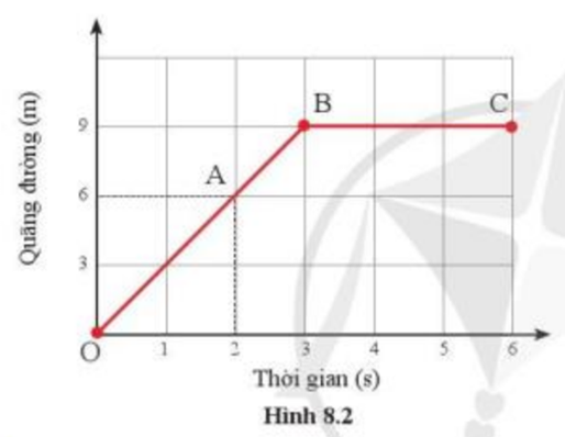 Từ đoạn đồ thị BC ở hình 8.2, em hãy cho biết trong khoảng thời gian từ 3s đến 6s vật tiếp tục chuyển động hay đứng yên? |
