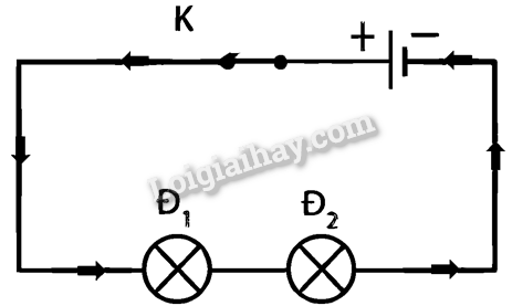 Vẽ sơ đồ điện khi đóng công tắc và biểu diễn chiều dòng điện theo quy ước đi từ cực dương sang cực âm.