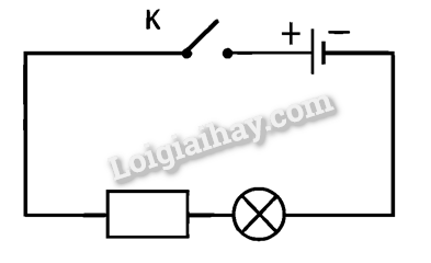 Vẽ sơ đồ mạch điện gồm một nguồn điện, công tắc mở, một bóng đèn và một điện trở mắc nối tiếp.