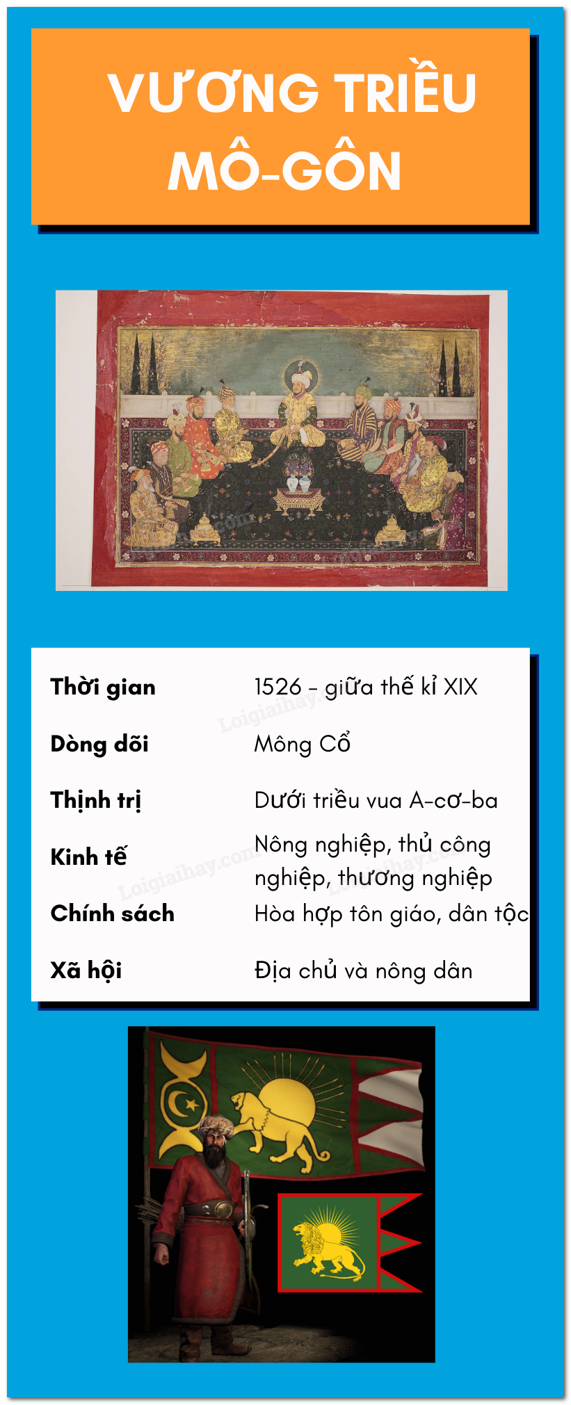 - Vương triều Mô-gôn ra đời năm 1526, gắn liền với cuộc xâm lược của một bộ phận người Mông Cổ (theo Hồi giáo). Sau khi đánh chiếm Đê-li, họ lập ra Vương triều Mô-gôn. Giữa thế kỉ XIX, đế quốc Anh xâm lược và lật đổ vương triều Mô-gôn.