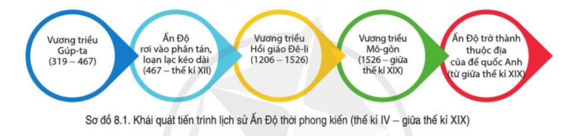 Đọc thông tin, tư liệu và quan sát sơ đồ 8.2, các hình 8.1, 8.3, hãy trình bày khái quát tình hình chính trị của Ấn Độ dưới thời các vương triều: Gúp-ta, Hồi giáo Đê li, Mô-gôn.