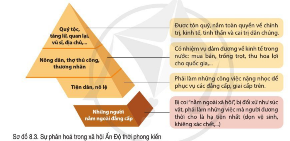 Đọc thông tin và quan sát sơ đồ 8.3, hãy khái quát tình hình xã hội của Ấn Độ dưới thời các vương triều: Gúp ta, Hồi giáo Đê-li, Mô-gôn.