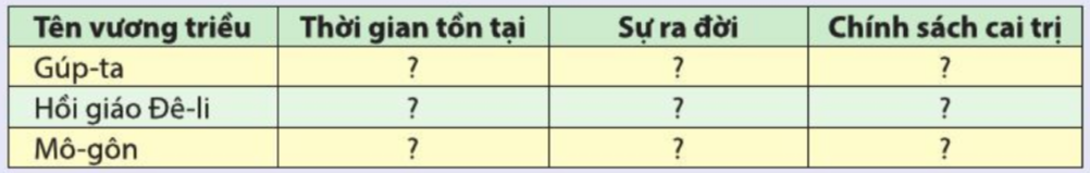 Hoàn thành bảng biểu về các vương triều ở Ấn Độ thời phong kiến (theo mẫu).