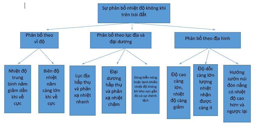 Trên Trái Đất, nhiệt độ có sự khác nhau giữa các vĩ độ là do hình dạng cầu của Trái Đất, khiến cho góc chiếu của tia sáng Mặt Trời giảm dần từ xích đạo về hai cực => nhiệt độ giảm từ xích đạo về hai cực.
