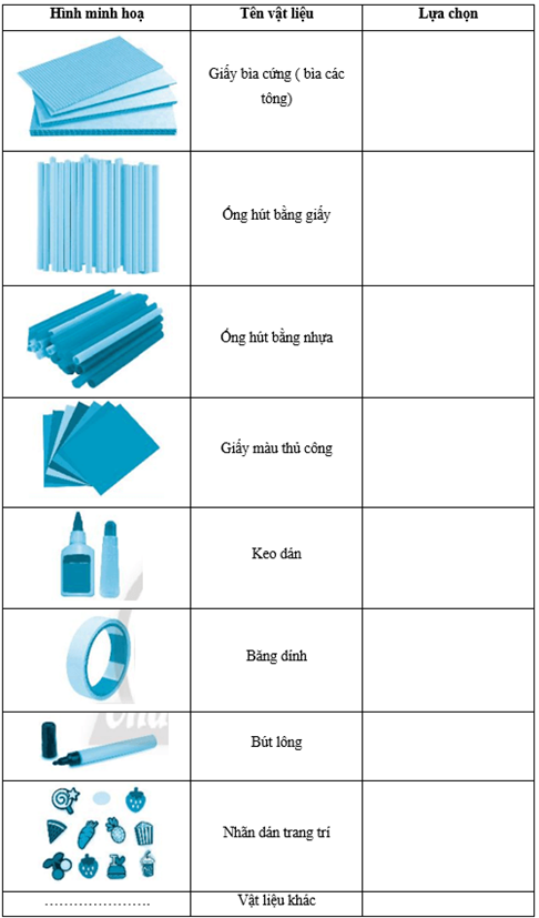 Em chọn những dụng cụ nào trong bảng dưới đây để làm biển báo giao thông ở bài tập 2? Hãy đánh dấu √ vào cột lựa chọn.