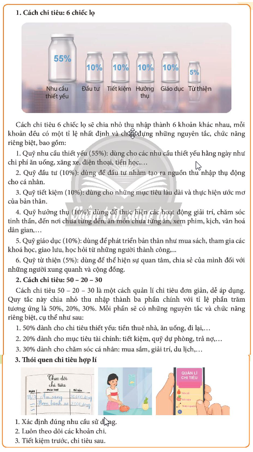 + Cách chi tiêu phù hợp với bản thân em là: chi tiêu theo nguyên tắc 6 chiếc lọ.