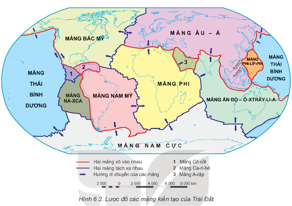 - Các mảng không đứng yên mà luôn dịch chuyển trên lớp quánh dẻo của manti. Trong khi dịch chuyển, các mảng kiến tạo có thể xô vào nhau hoặc tách xa nhau.