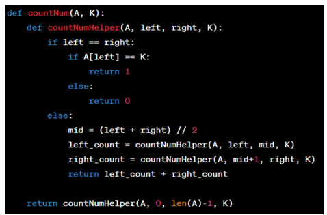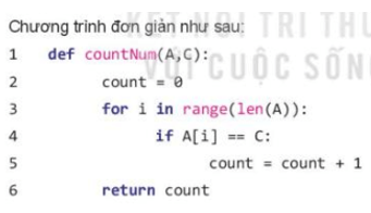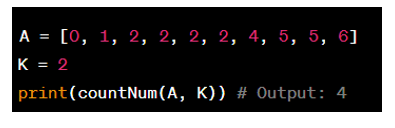 Với đầu vào là một dãy số A và một số K, hàm countNum sẽ trả về số lần xuất hiện của K trong dãy số A. Ví dụ: