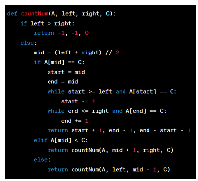 - Nếu giá trị tại vị trí mid bằng C, ta sử dụng hai biến start và end để tìm ra chỉ số đầu tiên và cuối cùng của vùng có giá trị bằng C. Sau đó, ta trả về giá trị start + 1, end - 1 và end - start - 1.