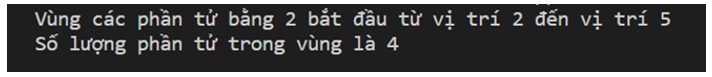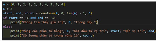 - Chương trình trả về ba giá trị start, end và count, tương ứng với chỉ số đầu tiên, chỉ số cuối cùng và số lượng phần tử của vùng có giá trị bằng C trong dãy A.