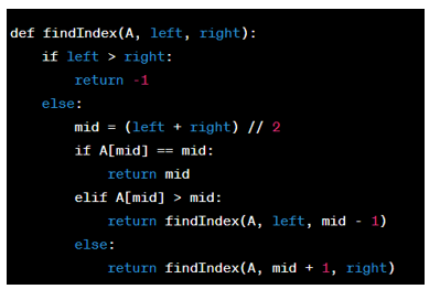 3. Nếu giá trị tại vị trí mid lớn hơn mid, tức là A[mid] > mid, thì tiếp tục tìm vị trí thích hợp trong đoạn từ left đến mid-1