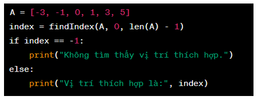 Kết quả sẽ là "Vị trí thích hợp là: 3", tức là phần tử thứ 3 trong dãy A có giá trị bằng 3.