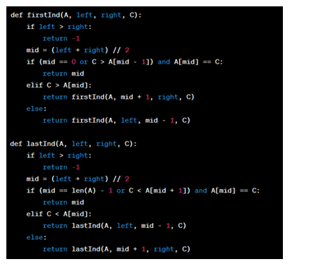 Để thiết lập hai hàm firstInd và lastInd bằng kĩ thuật chia để trị, ta có thể áp dụng phương pháp tương tự như khi tìm kiếm số lần xuất hiện của một phần tử trong dãy số bằng kĩ thuật chia để trị. Cụ thể, ta sẽ chia dãy số thành hai nửa và tìm kiếm đệ quy trên từng nửa đó.