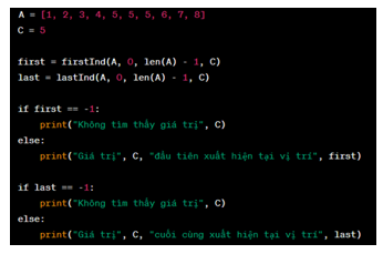 Giả sử ta cần tìm số lần xuất hiện của số C trong dãy A đã sắp xếp tăng dần. Đầu tiên, ta sử dụng hàm firstInd để tìm chỉ số của phần tử đầu tiên có giá trị bằng C, sau đó sử dụng hàm lastInd để tìm chỉ số của phần tử cuối cùng có giá trị bằng C. Nếu cả hai hàm đều trả về giá trị khác -1, số lần xuất hiện của C trong dãy A sẽ là hiệu của chỉ số của phần tử cuối cùng và phần tử đầu tiên cộng thêm 1.
