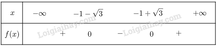Vậy tam thức đã cho có dạng là \(f\left( x \right) = {x^2} + 2x - 2\) âm trên khoảng \(\left( { - 1 - \sqrt 3 ; - 1 + \sqrt 3 } \right)\), dương trên khoảng \(\left( { - \infty ; - 1 - \sqrt 3 } \right)\) và \(\left( { - 1 + \sqrt 3 ; + \infty } \right)\)