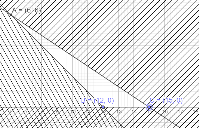 Miền nghiệm của hệ bất phương trình là miền nghiệm tam giác ABC, trong đó \(A(6;6),B(12;0),C(15;0)\)