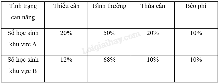 Vào đầu năm học, người ta lựa chọn ngẫu nhiên một số học sinh lớp 9 ở khu vực A và khu vực B để kiểm tra tình trạng cân nặng. Kết quả khảo sát được ghi lại ở bảng sau: