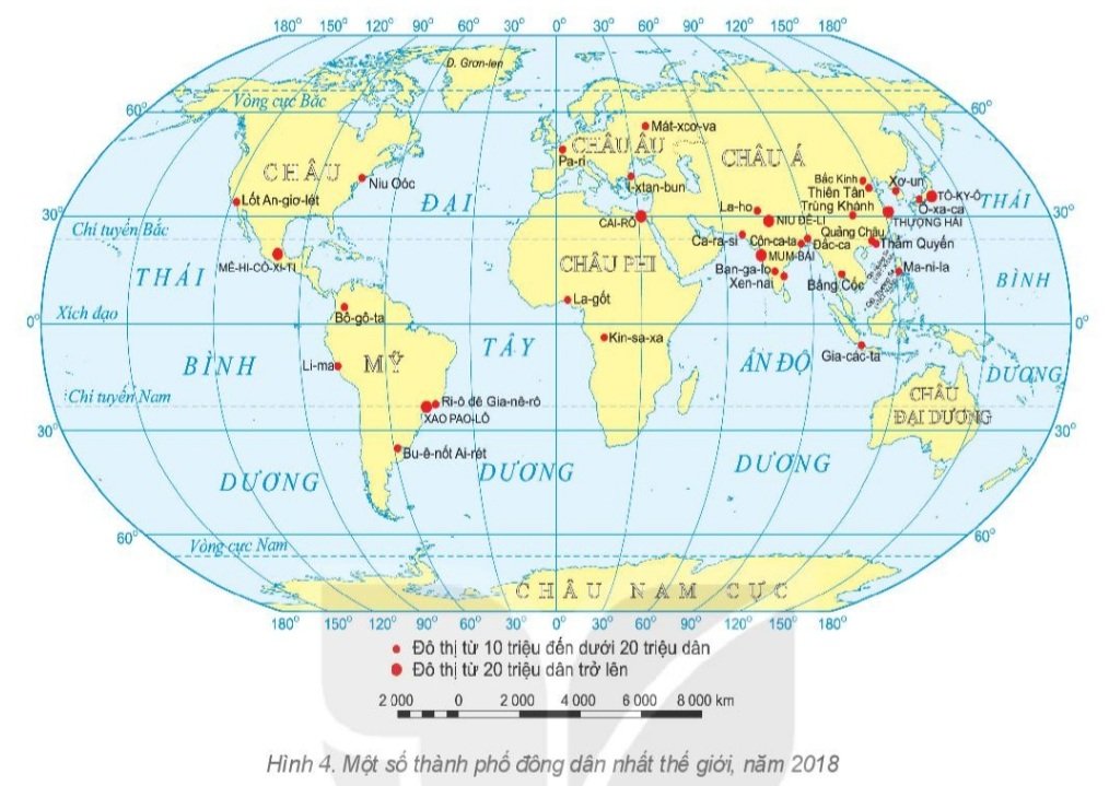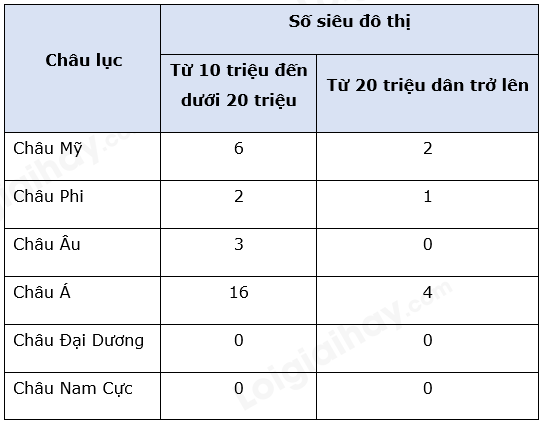 - Các siêu đô thị tập trung nhiều nhất ở châu Á (từ 10 đến dưới 20 triệu dân có 16 siêu đô thị, từ 20 triệu dân trở lên có 4 đô thị).