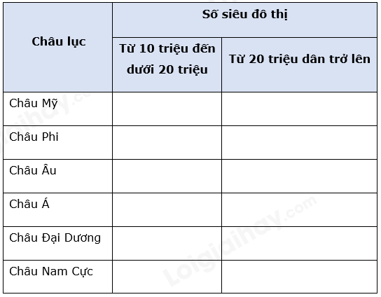 - Châu Đại Dương và châu Nam Cực không có siêu đô thị nào.