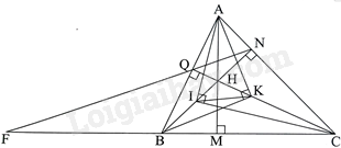 mà \(AN.AC = AQ.AB\) (vì \(\frac{{AN}}{{AB}} = \frac{{AQ}}{{AC}}\)) và \(A{I^2} = AN.AC\) nên \(AI = AK\). Vậy \(\Delta AIK\) cân tại A.