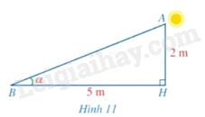 Hình 11 mô tả tia nắng mặt trời dọc theo \(AB\) tạo với phương nằm ngang trên mặt đất một góc \(\alpha = \widehat {ABH}\). Sử dụng máy tính cầm tay, tính số đo góc \(\alpha \) (làm tròn kết quả đến hàng đơn vị của độ), biết \(AH = 2m,BH = 5m\).