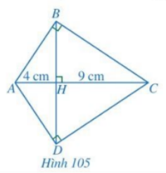 \(\begin{array}{l} \Rightarrow \frac{{HA}}{{HD}} = \frac{{HD}}{{HC}}\\ \Rightarrow H{D^2} = HA.HC\\ \Rightarrow H{D^2} = 4.9 = 36\\ \Rightarrow HD = 6cm\end{array}\)