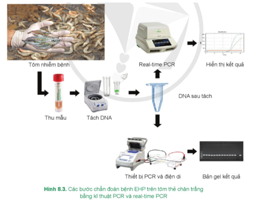Luyện tập: Dựa vào Hình 8.3, hãy trình bày các bước để xác định bệnh do vi bào tử trùng EHP trên tôm thẻ chân trắng bằng phương pháp PCR và real- time PCR.