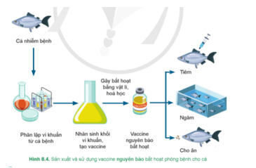 Luyện tập: Dựa vào hình 8.4, hãy mô tả quy trình sản xuất và sử dụng vaccine nguyên bào bất hoạt phòng bệnh cho cá.