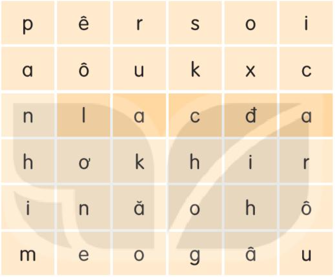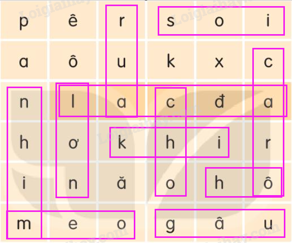 Ghép các chữ đứng liền nhau (thêm dấu thanh) để tạo tên gọi các loài vật được minh họa ở dưới. Đọc. Tìm trong bài đọc trên những tiếng có vần ơi, ao, ăng. Chép vào vở khổ thơ cuối.