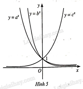 Cho ba số thực dương \(a,{\rm{ }}b,{\rm{ }}c\) khác 1 và đồ thị của ba hàm số mũ \(y = {a^x},\)\(y = {b^x}\) và \(y = {c^x}\) được cho bởi Hình 5. Kết luận nào sau đây là đúng đối với ba số\(a,{\rm{ }}b,{\rm{ }}c?\)