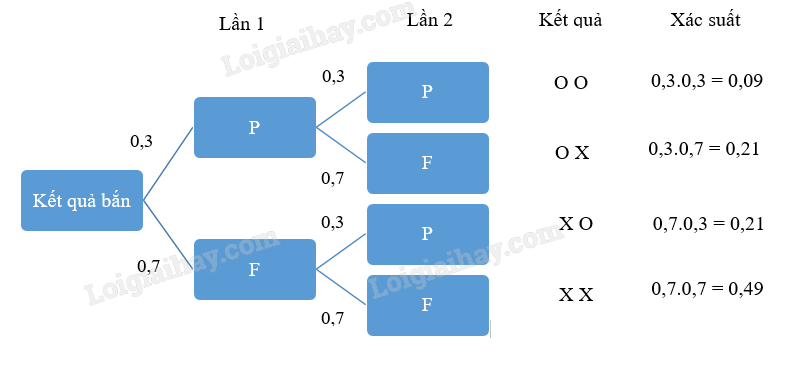 a) Vẽ sơ đồ hình cây mô tả các khả năng xảy ra và xác suất tương ứng khi người bắn cung thực hiện hai lần bắn liên tiếp nhau.