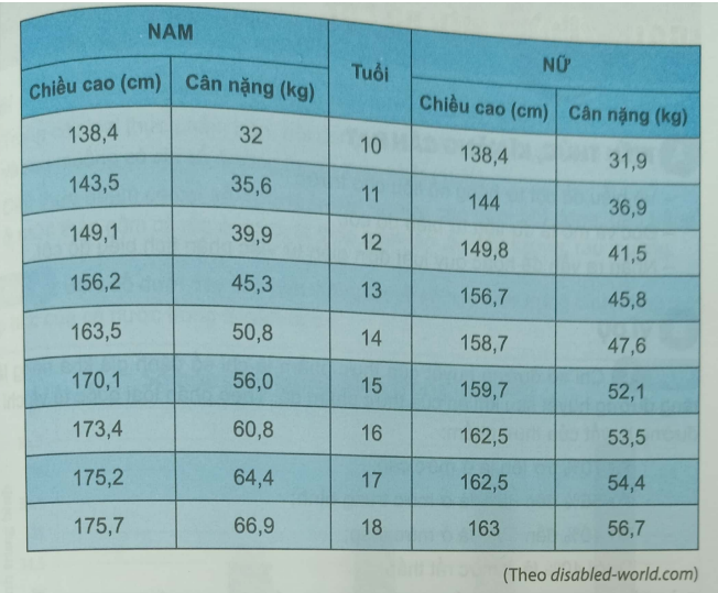 Bảng dưới đây cho biết chiều cao, cân nặng chuẩn của học sinh Việt Nam từ 10 tuổi đến 18 tuổi.